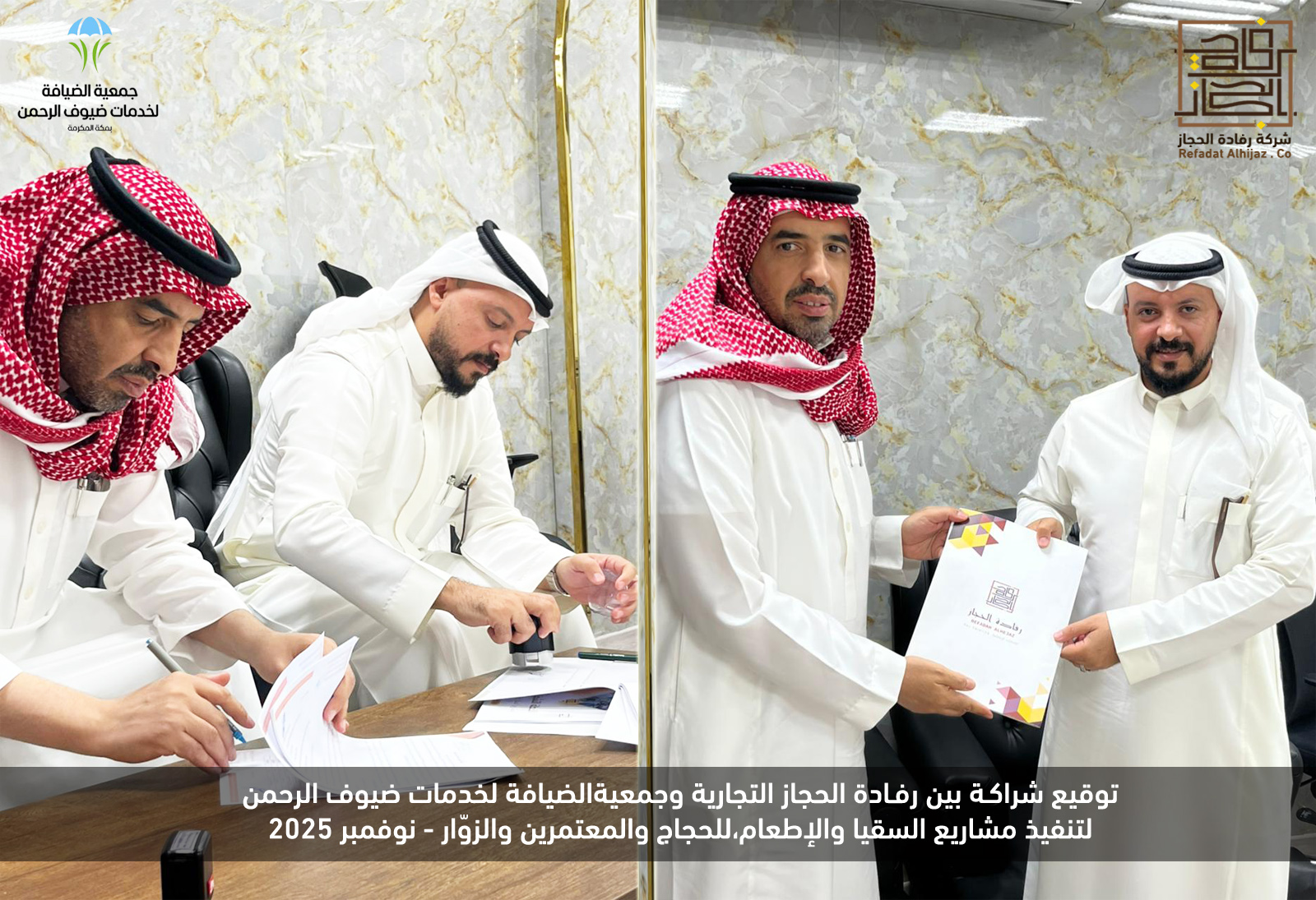 في إطار توسيع دائرة الشراكات وفتح نوافذ التعاون، وقّعت شركة رفادة الحجاز التجارية عقداً مع جمعية الضيافة لخدمات ضيوف الرحمن بمكة المكرمة، وذلك لتنفيذ مشاريع السقيا والإطعام للحجاج والمعتمرين والزوّار.