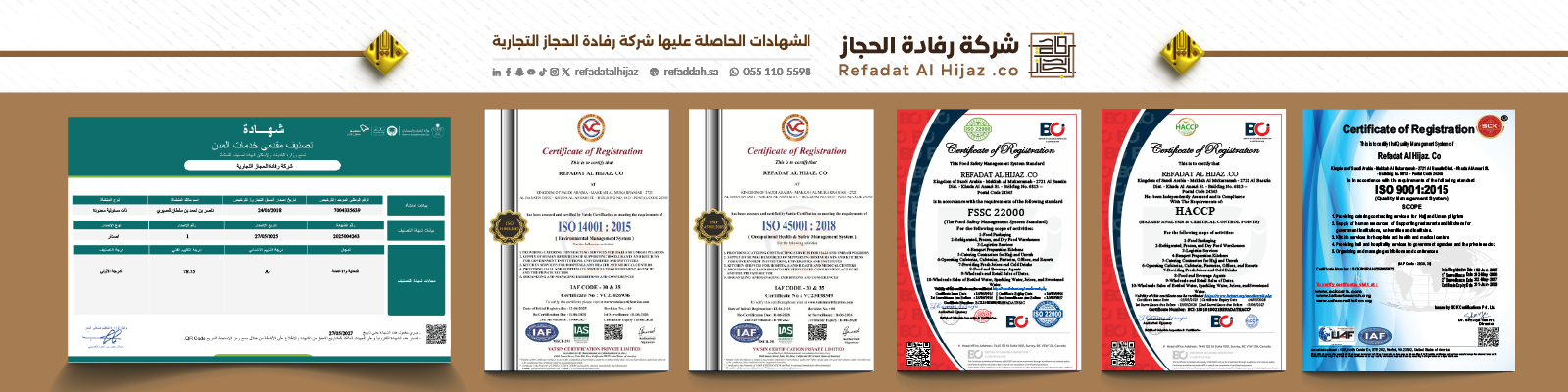 شركة رفادة الحجاز التجارية مرخصة من وزارة التجارة والاستثمار برقم 4031215418 ومسجلة برقم ضريبي 310212598700003.